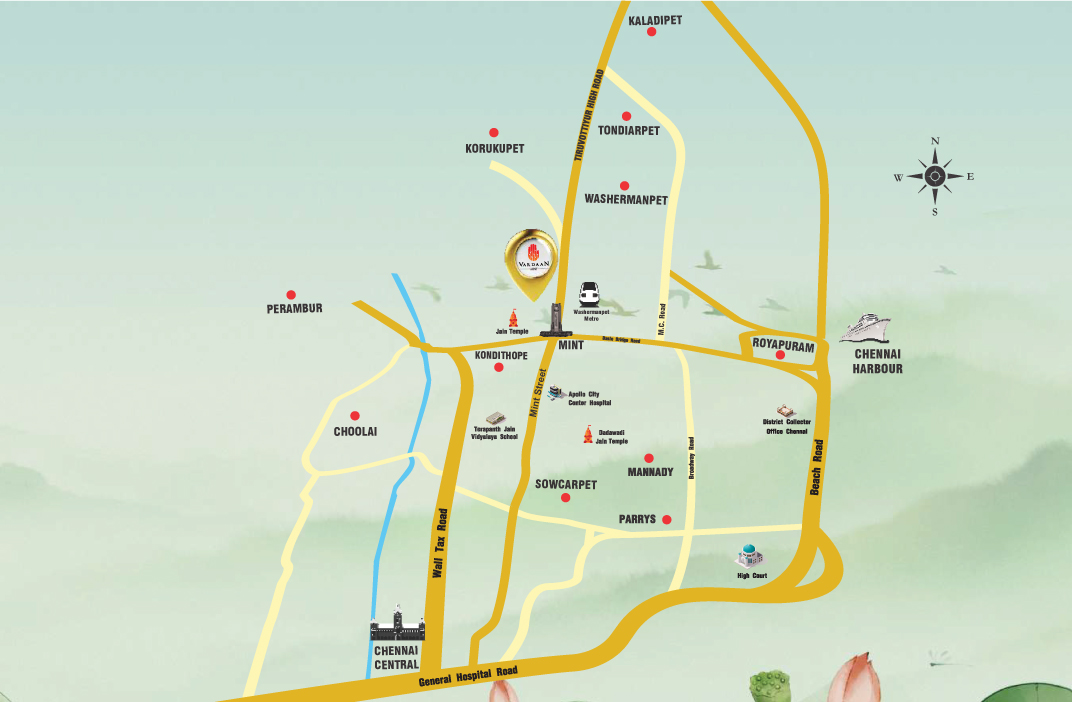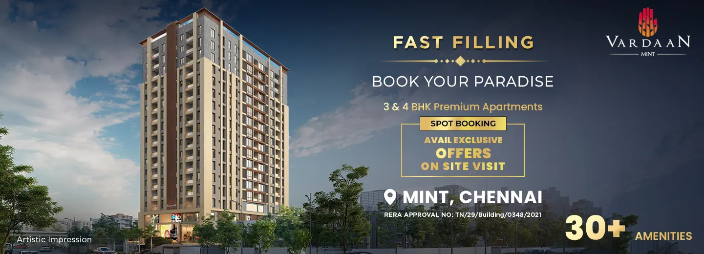 Vardaan captures the dynamic spirit of the city with skillfully crafted homes. This magnificent 17-storey landmark features 86 elegant 3 and 4 BHK residences, meticulously designed with lesser common walls and zero dead space. Set in the heart of Chennai's bustling epicentre-Mint Street, the property is situated right next to the iconic Mint Clock Tower and opposite to the Washermanpet Metro Station. With residential and commercial spaces harmoniously coexisting in the same development, most often you'll be riding the elevator to reach work.